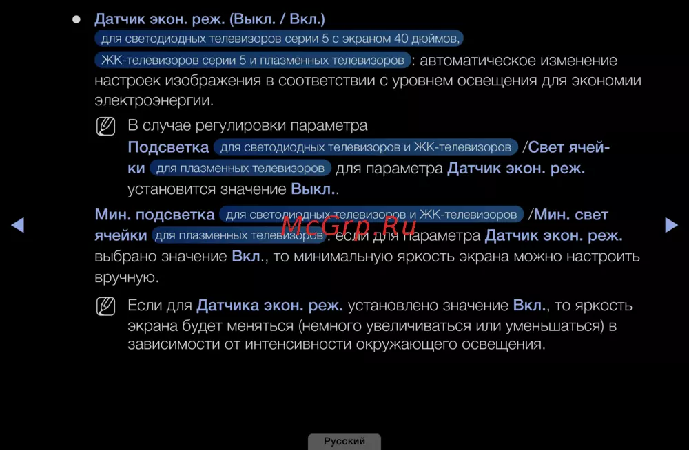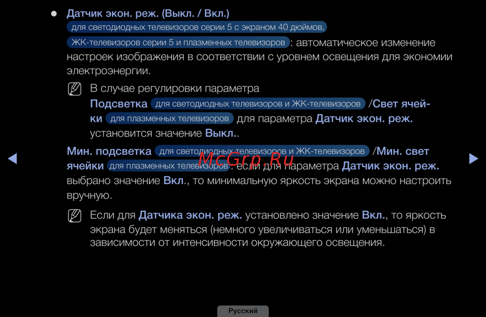 Умный датчик автоматически корректирует яркость экрана в зависимости от уровня освещения, экономя электроэнергию и защищая глаза. Подходит для светодиодных, ЖК и плазменных моделей. Настройки можно вручную регулировать при включенной функции.