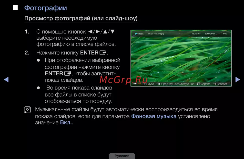 Узнайте, как просматривать фотографии и запускать слайд-шоу с помощью простых кнопок. Наслаждайтесь автоматическим воспроизведением музыки во время показа.
