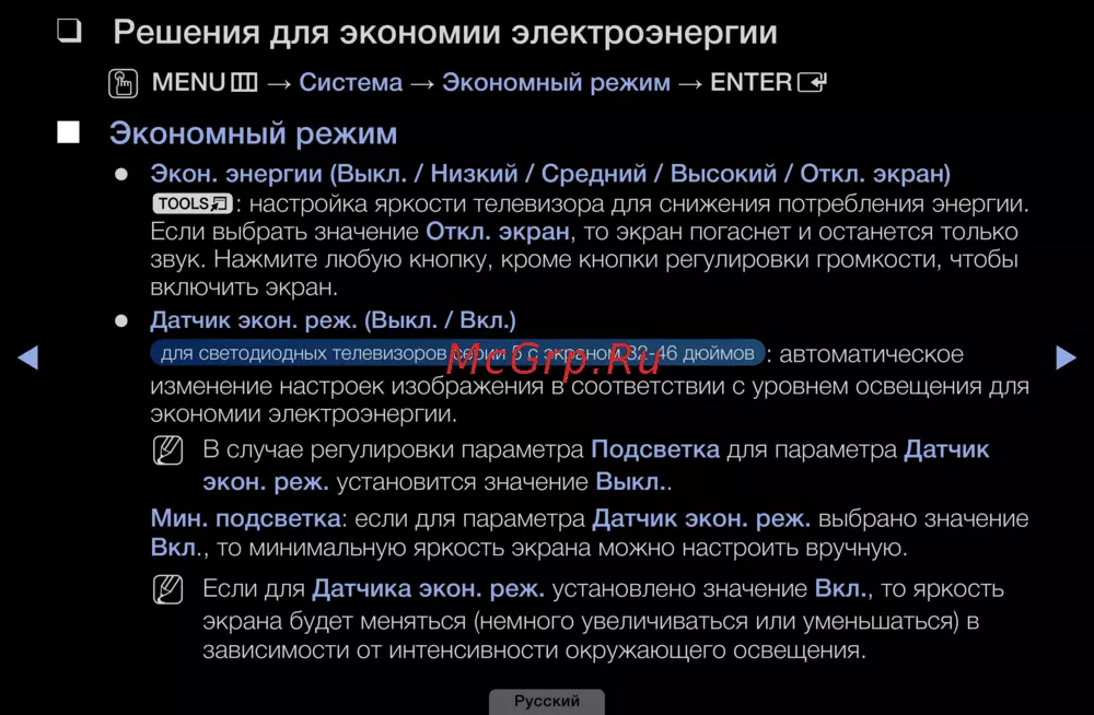 Экон.❑энергии❑(Выкл.❑/❑Низкий❑/❑Средний❑/❑Высокий❑/❑Откл.❑экран)