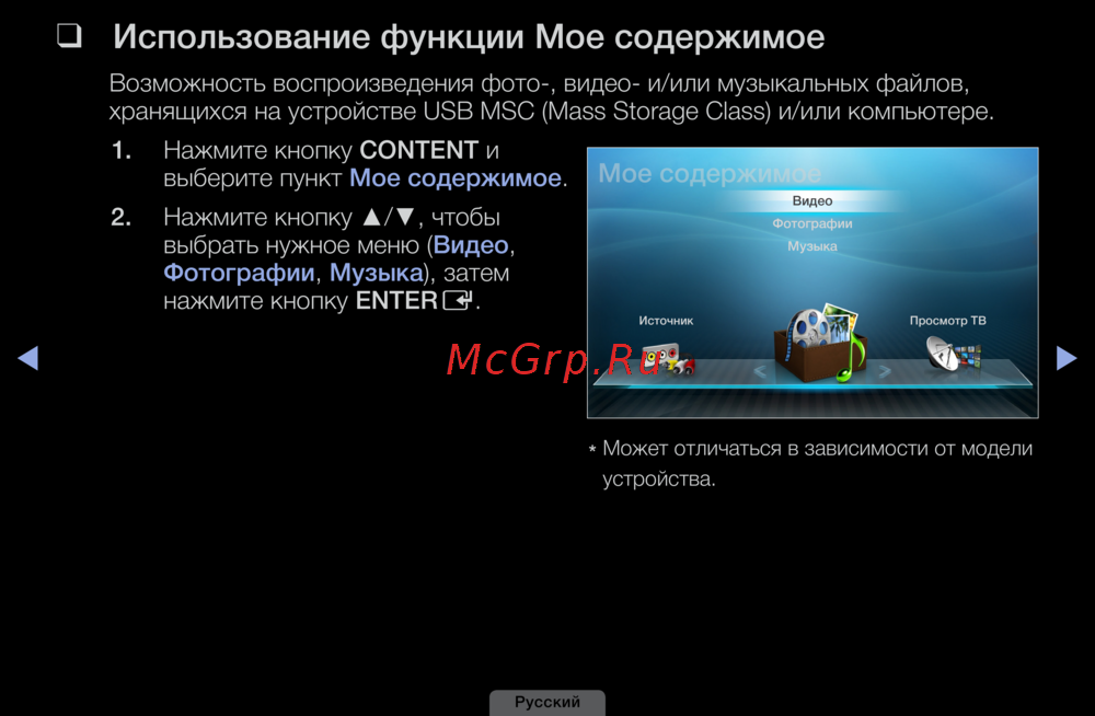 - С помощью кнопок перейдите к нужному файлу а затем нажмите кнопку enter e или воспр начнется воспроизведение файла в зависимости от способа перехода к экрану мое содержимое его вид может отличаться p.147