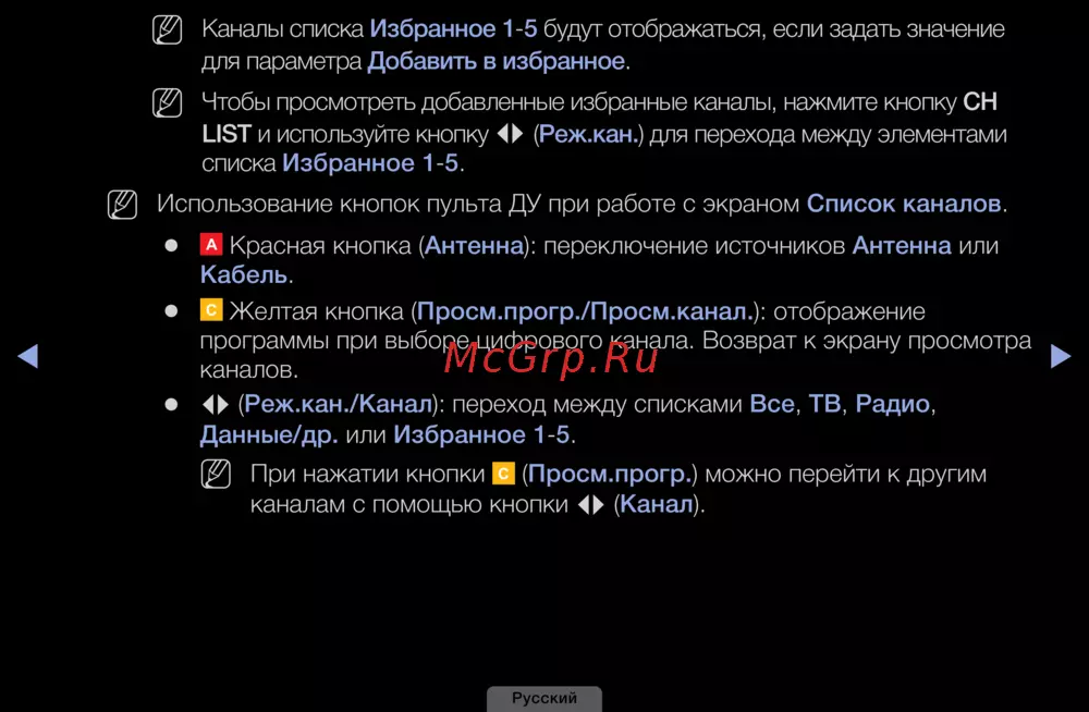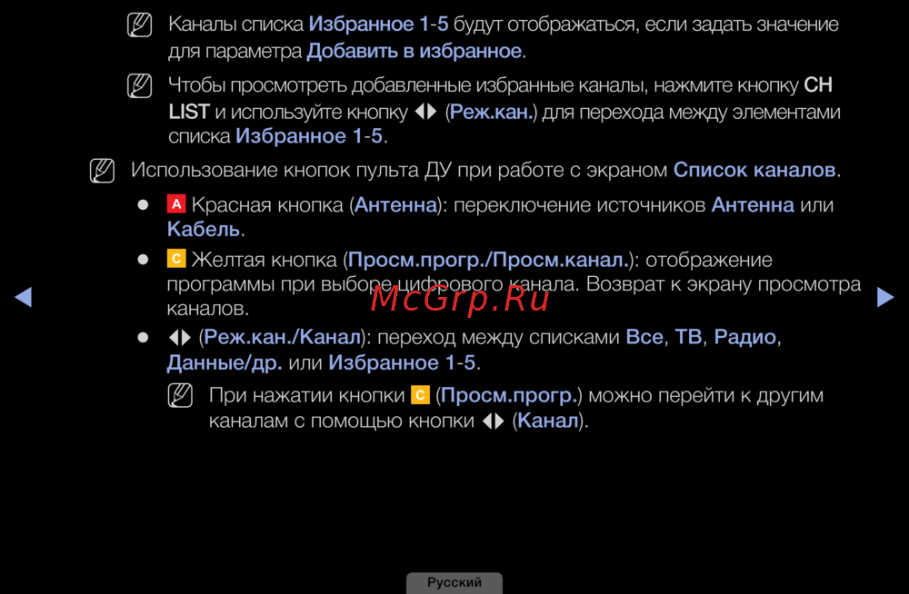 Использование кнопок пульта ДУ при работе с экраном Список❑каналов.