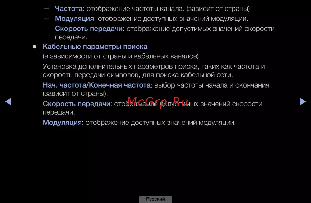 Узнайте, как настроить параметры поиска кабельных каналов, включая частоту, модуляцию и скорость передачи для оптимального просмотра.