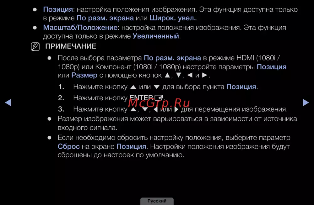 1080p) или Компонент (1080i / 1080p) настройте параметры Позиция