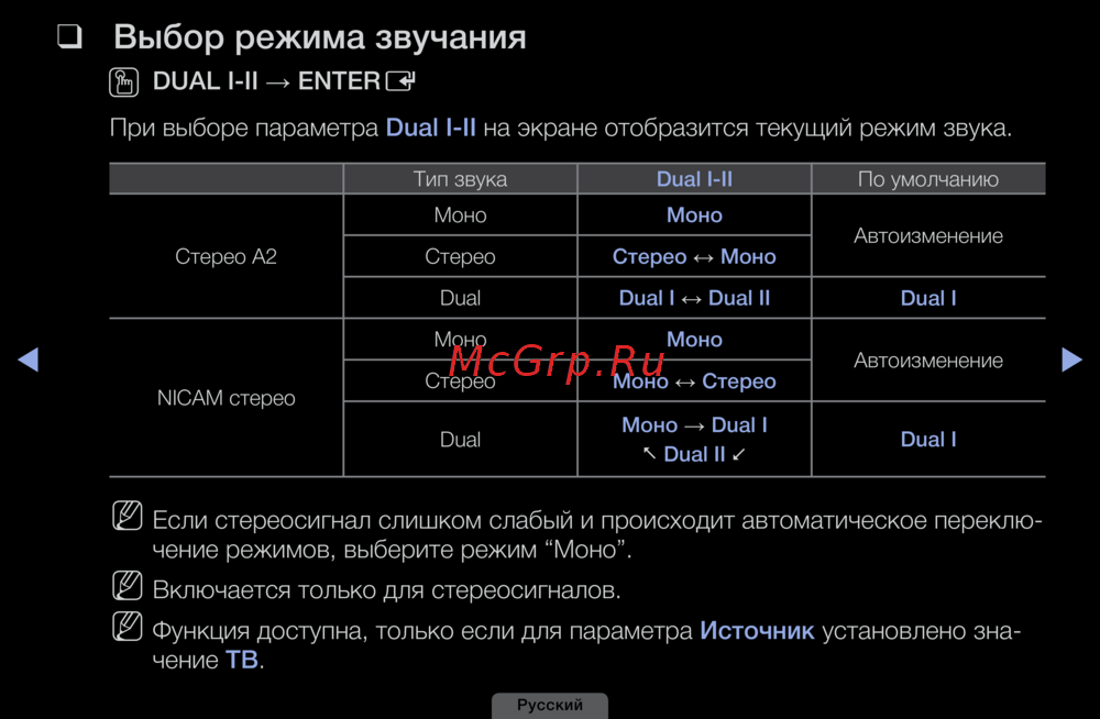 При выборе параметра Dual I-II на экране отобразится текущий режим звука.