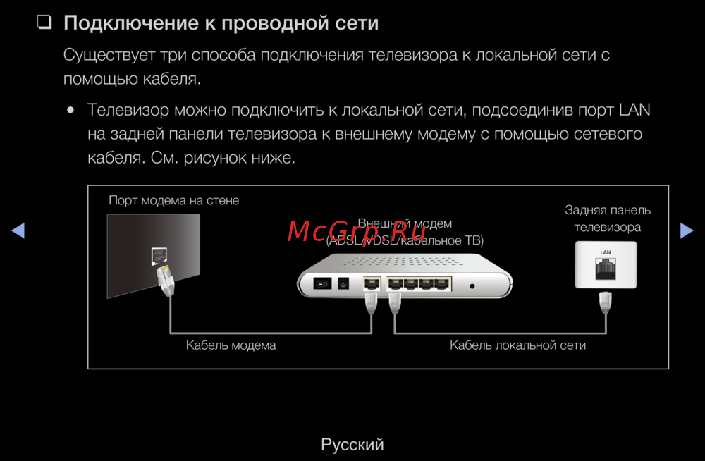 на задней панели телевизора к внешнему модему с помощью сетевого