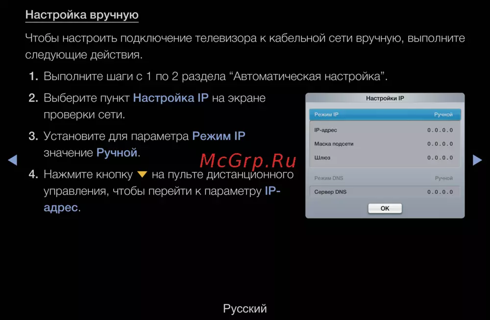Чтобы настроить подключение телевизора к кабельной сети вручную, выполните