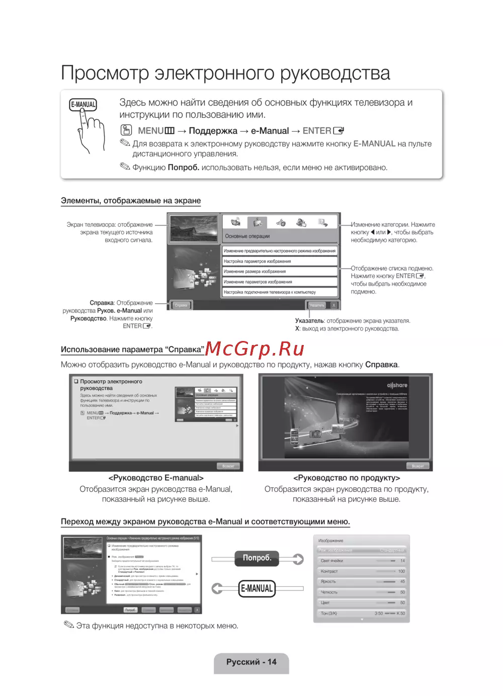 Переход между экраном руководства e-Manual и соответствующими меню.