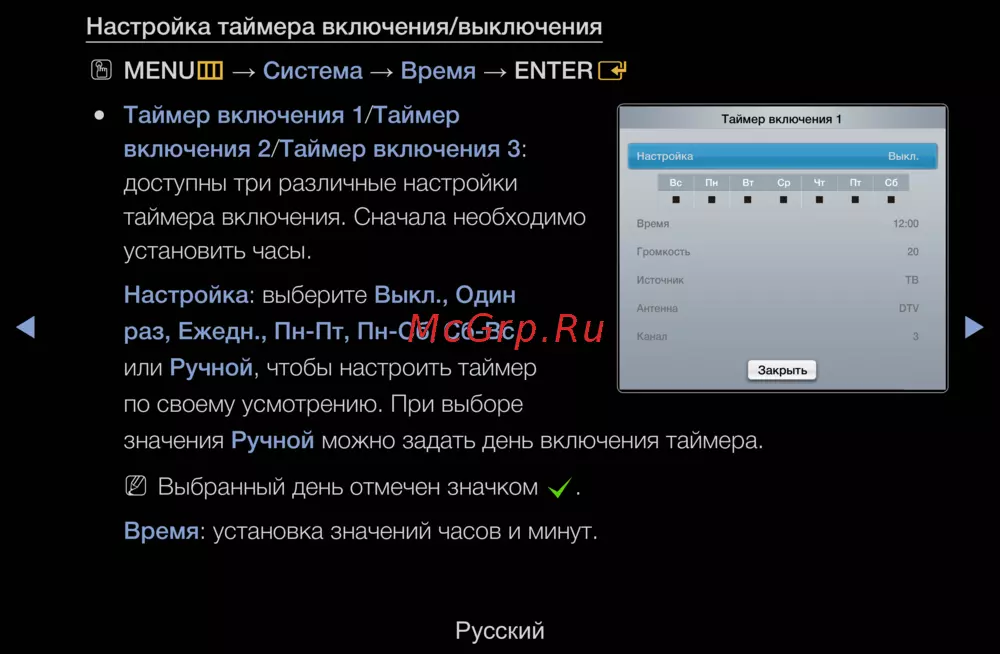 значения Ручной можно задать день включения таймера.