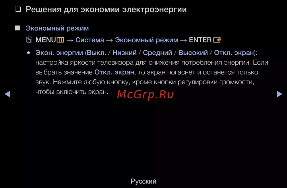 Экон. энергии (Выкл. / Низкий / Средний / Высокий / Откл. экран):