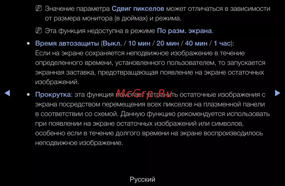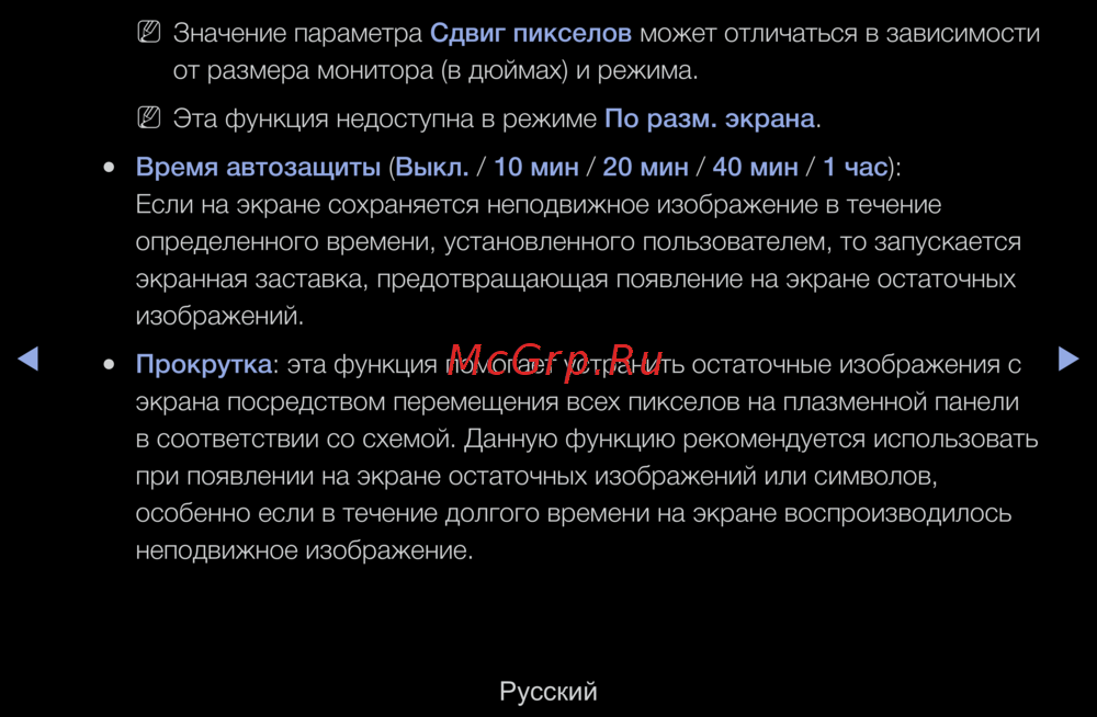 Узнайте о значении параметра сдвига пикселов и настройках автозащиты экрана. Защитите экран от остаточных изображений с помощью прокрутки и экранной заставки.