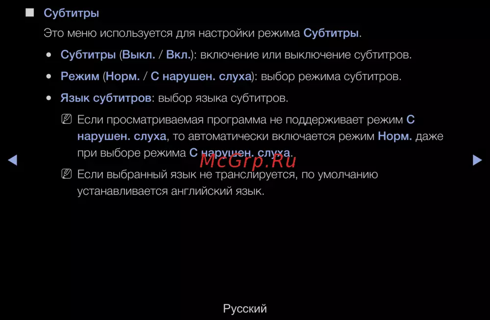 Режим (Норм. / С нарушен. слуха): выбор режима субтитров.