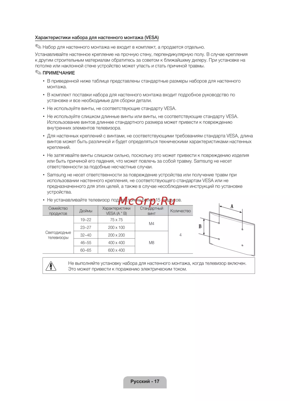 Не выполняйте установку набора для настенного монтажа, когда телевизор включен.