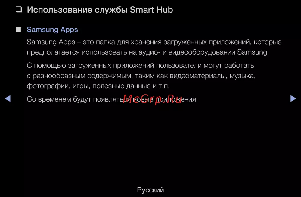 - Smart hub обеспечивает доступ ко всему содержимому которое хранится в одном месте эта функция помогает при выборе различного содержимого развлекательного характера обеспечивает управление средой развлекательных программ с помощью простого и понятного интерфейса пользователя предоставляет доступ к различным приложениям состав которых каждый день расширяется позволяет настроить систему тв путем группировки и сортировки приложений по своему усмотрению p.18