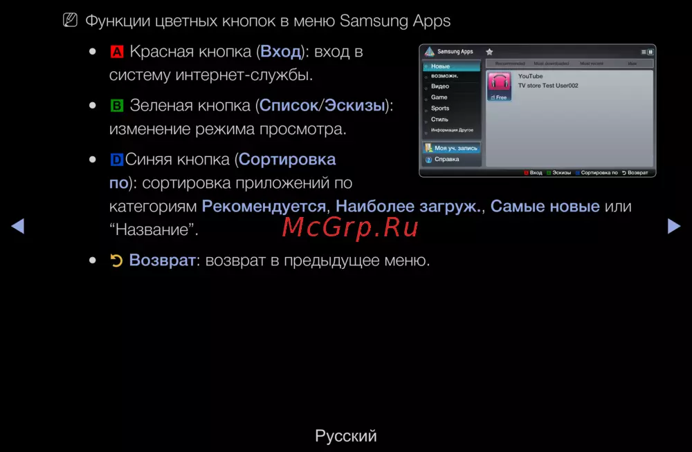 Узнайте о функциях цветных кнопок в меню приложений, включая вход в систему, изменение режима просмотра и сортировку по категориям. Упрощайте навигацию!