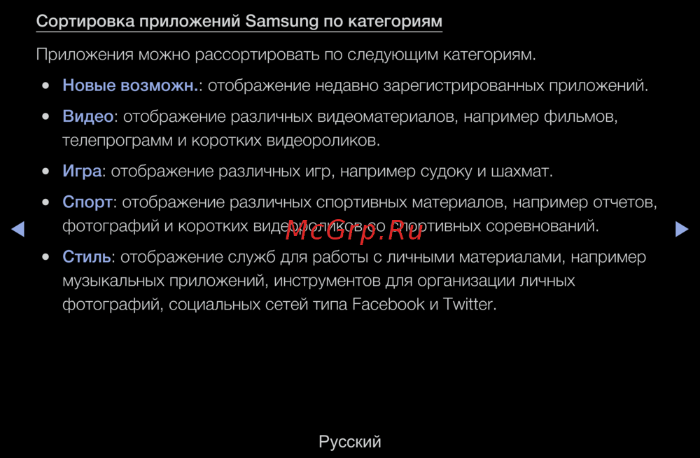 Samsung UE-40 D5520RW — сортировка приложений по категориям: новые, видео, игры и спорт [212/319]