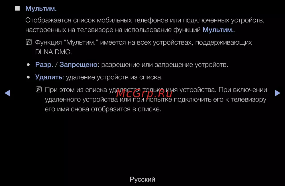 Узнайте, как управлять мобильными телефонами и другими устройствами, подключенными к телевизору, с помощью функции мультимедиа. Настройте разрешения и удаляйте устройства из списка.