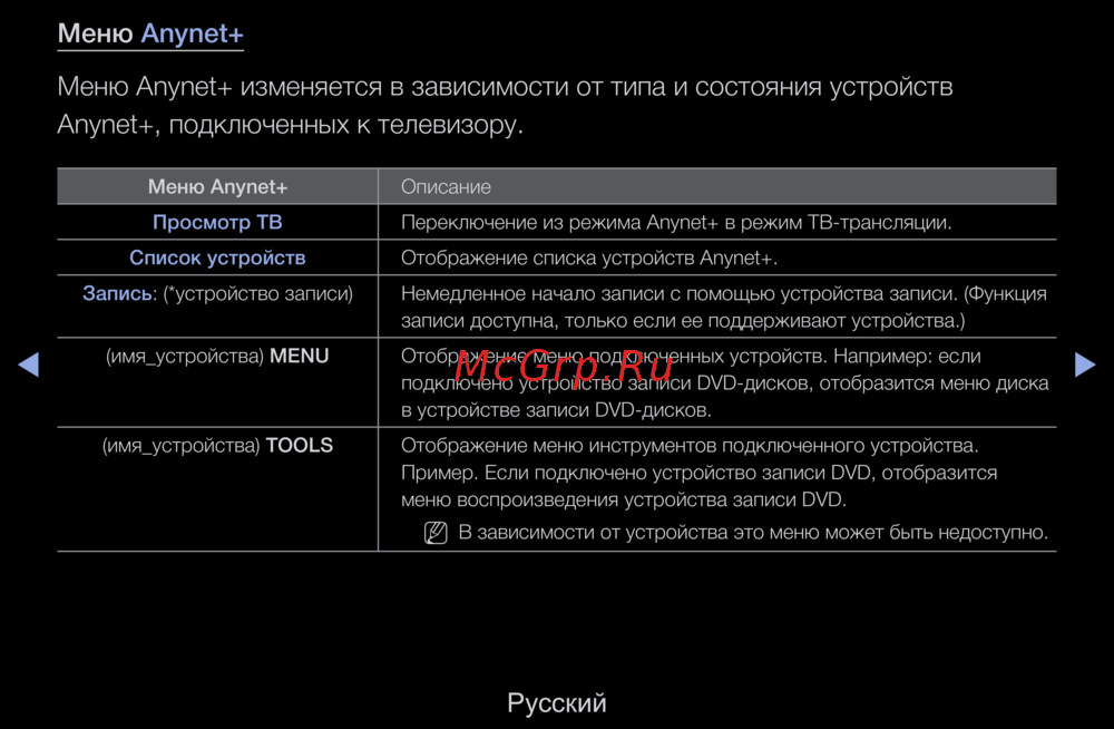 Изучите возможности меню Anynet+, которое адаптируется к подключенным устройствам. Узнайте, как переключаться между режимами и использовать функции записи.