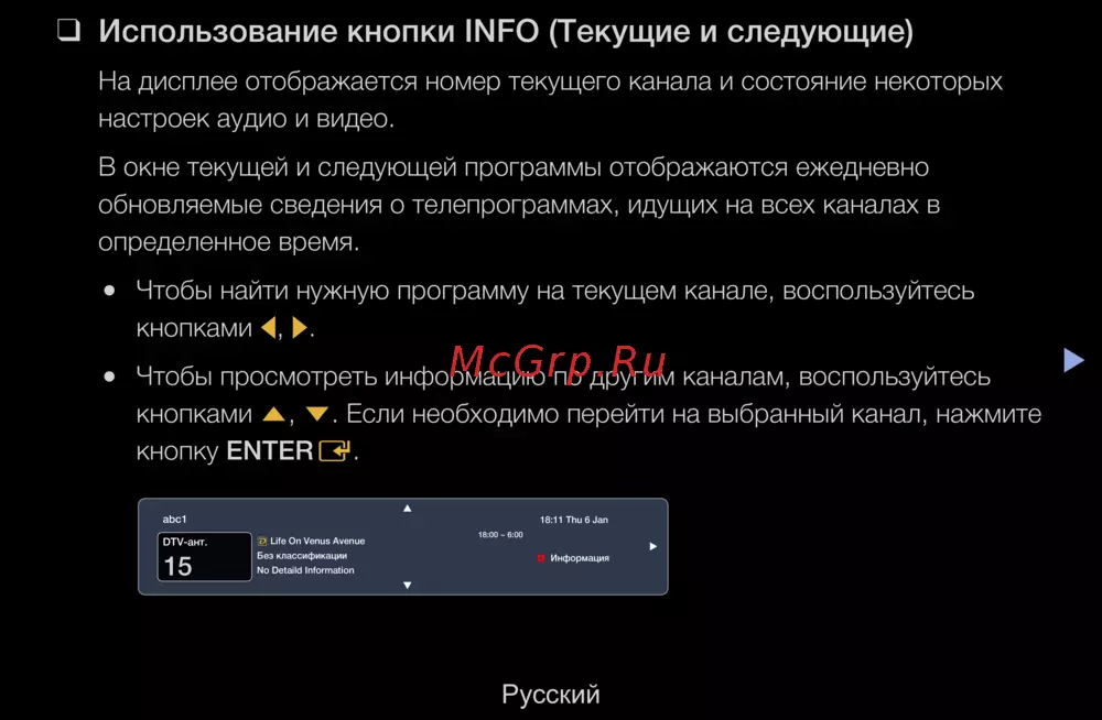 Узнайте, как использовать кнопку INFO для получения информации о текущих и следующих телепрограммах. Легко находите нужные каналы и программы.