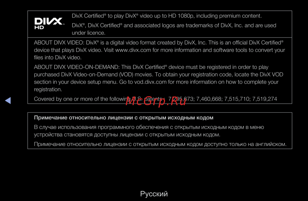 Это устройство поддерживает воспроизведение видео в формате DivX до HD 1080p, включая контент по запросу. Узнайте больше о регистрации и использовании.