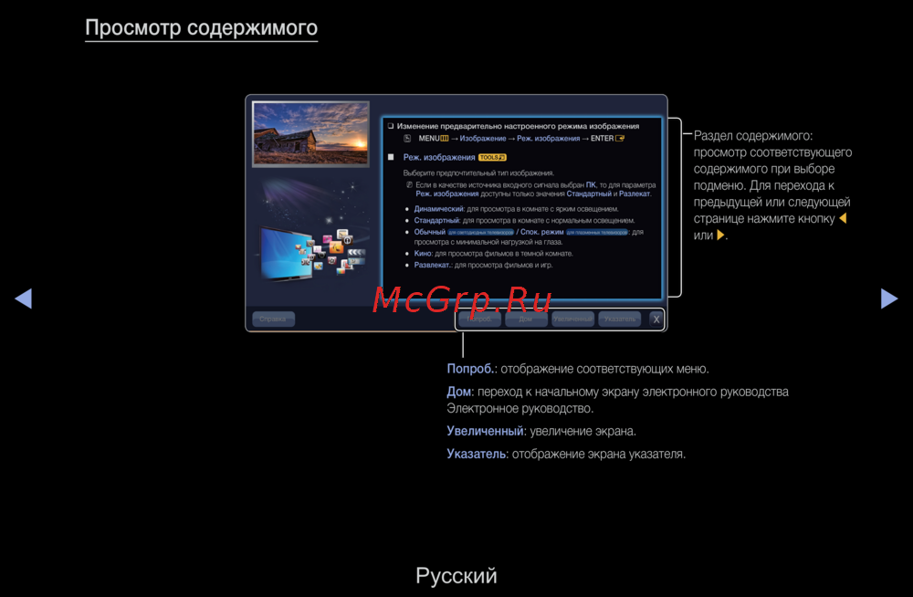 Изучите возможности электронного руководства, включая настройки изображения и навигацию. Узнайте, как выбрать режим изображения для комфортного просмотра.