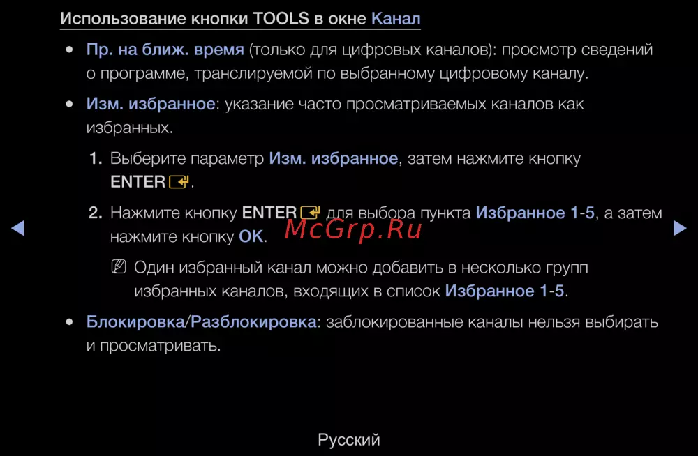 Узнайте, как эффективно использовать кнопку TOOLS для просмотра информации о программах и управления избранными каналами. Блокировка и разблокировка каналов также доступны.