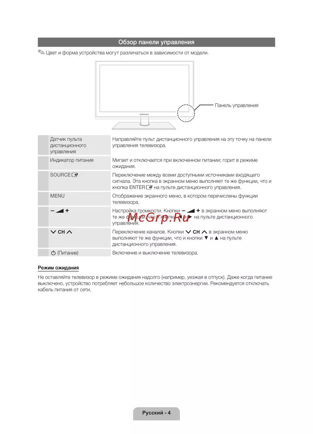 Узнайте о функциях панели управления телевизора, включая переключение источников, настройку громкости и управление каналами. Полезные советы по экономии энергии.