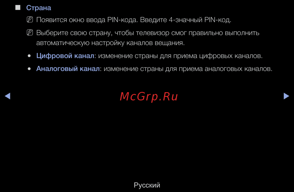 Аналоговый канал: изменение страны для приема аналоговых каналов.