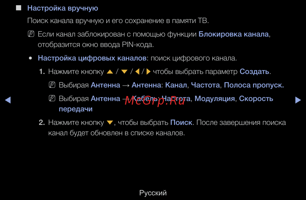 Поиск канала вручную и его сохранение в памяти ТВ.
