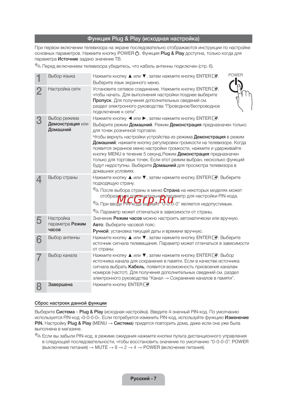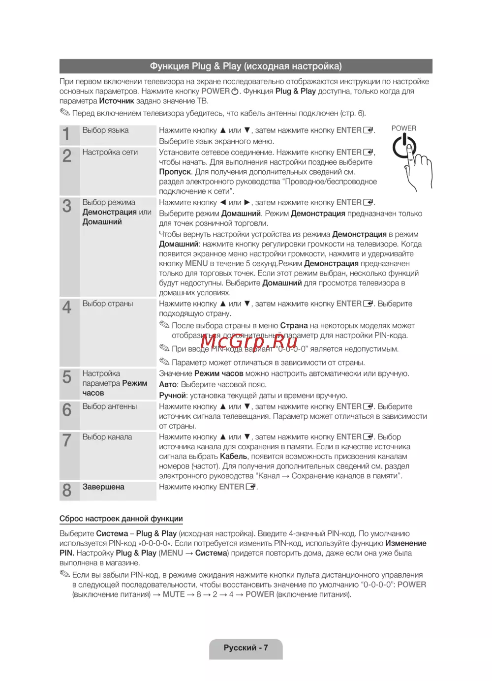 PIN. Настройку Plug & Play (MENU → Система) придется повторить дома, даже если она уже была