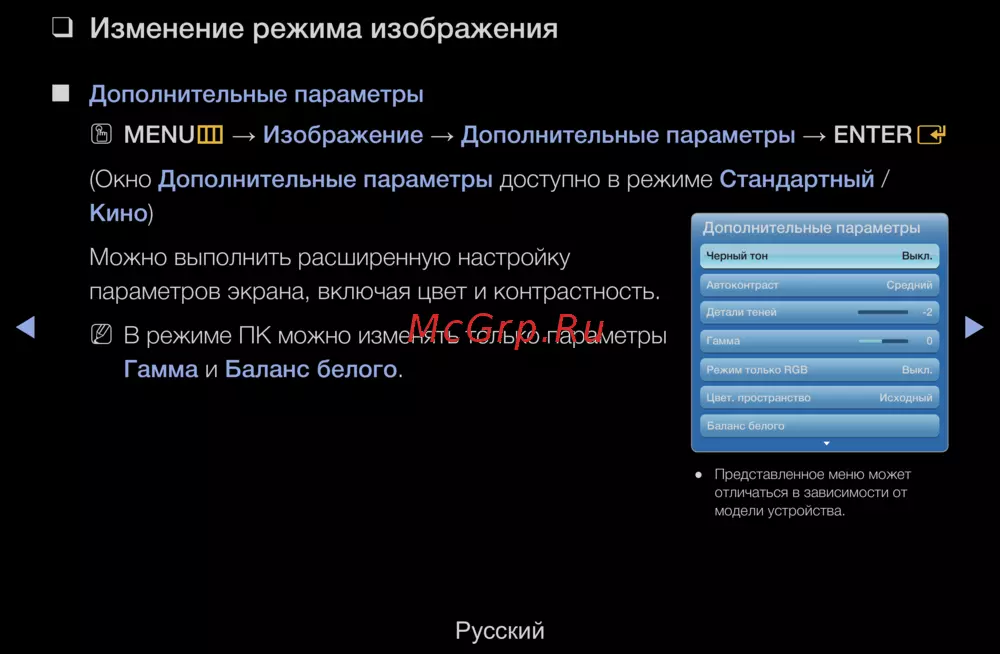 Узнайте, как изменить режим изображения и настроить параметры экрана, включая цвет, контрастность и баланс белого для оптимального просмотра.