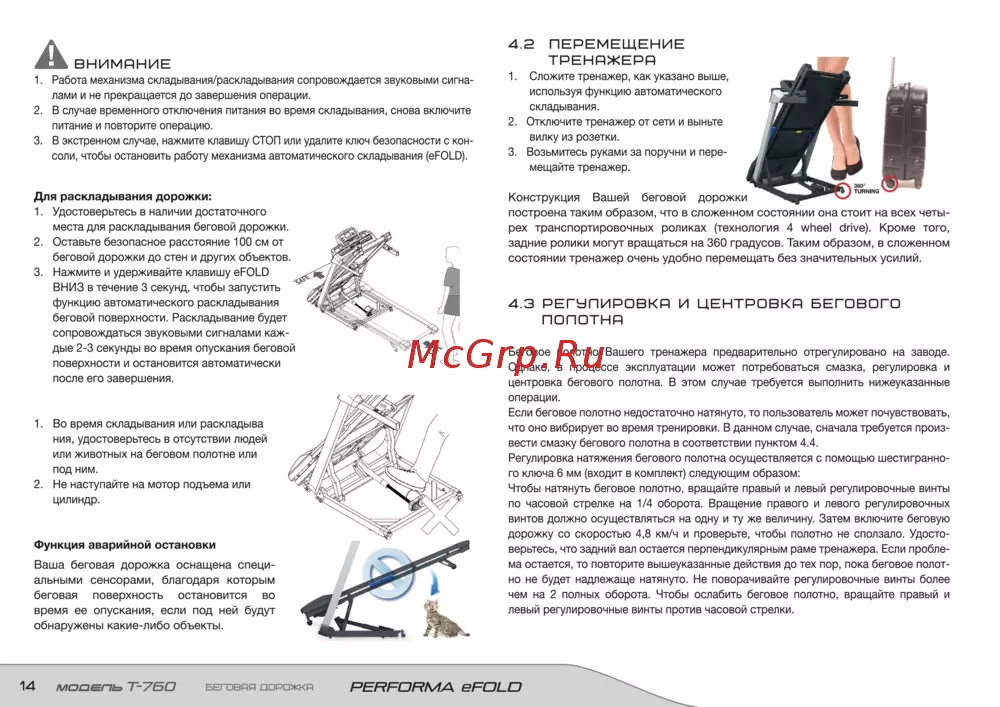 4 2 ПЕРЕМЕЩЕНИЕ ТРЕНАЖЕРА ВНИМАНИЕ 1 Работа механизма складывания раскладывания сопровождается звуковыми сигна лами и не прекращается до завершения операции 2 В случае временного отключения питания во время складывания снова включите питание и повторите операцию 3 В экстренном случае нажмите клавишу СТОП или удалите ключ безопасности с кон соли чтобы остановить работу механизма автоматического складывания еРОШ 1 Сложите тренажер как указано выше используя функцию автоматического складывания 2 Отключите тренажер от сети и выньте вилку из розетки 3 Возьмитесь руками за поручни и пере мещайте тренажер Для раскладывания дорожки 1 Удостоверьтесь в наличии достаточного места для раскладывания беговой дорожки 2 Оставьте безопасное расстояние 100 см от беговой дорожки до стен и других объектов 3 Нажмите и удерживайте клавишу еРОШ ВНИЗ в течение 3 секунд чтобы запустить функцию автоматического раскладывания беговой поверхности Раскладывание будет сопровождаться звуковыми сигналами каж дые 2 3 секунды во время опускания беговой поверхности и остановится автоматически после его завершения Конструкция Вашей беговой дорожки построена таким образом что в сложенном состоянии она стоит на всех четы рех транспортировочных роликах технология 4 wheel drive Кроме того задние ролики могут вращаться на 360 градусов Таким образом в сложенном состоянии тренажер очень удобно перемещать без значительных усилий 4 3 РЕГНПИРОВКА И ЦЕНТРОВКА БЕГОВОГО ПОПОТНА Беговое полотно Вашего тренажера предварительно отрегулировано на заводе Однако в процессе эксплуатации может потребоваться смазка регулировка и центровка бегового полотна В этом случае требуется выполнить нижеуказанные операции Если беговое полотно недостаточно натянуто то пользователь может почувствовать что оно вибрирует во время тренировки В данном случае сначала требуется произ вести смазку бегового полотна в соответствии пунктом 4 4 Регулировка натяжения бегового полотна осуществляется с помощью шестигранно го ключа 6 мм входит в комплект следующим образом Чтобы натянуть беговое полотно вращайте правый и левый регулировочные винты по часовой стрелке на 1 4 оборота Вращение правого и левого регулировочных винтов должно осуществляться на одну и ту же величину Затем включите беговую дорожку со скоростью 4 8 км ч и проверьте чтобы полотно не сползало Удосто верьтесь что задний вал остается перпендикулярным раме тренажера Если пробле ма остается то повторите вышеуказанные действия до тех пор пока беговое полот но не будет надлежаще натянуто Не поворачивайте регулировочные винты более чем на 2 полных оборота Чтобы ослабить беговое полотно вращайте правый и левый регулировочные винты против часовой стрелки 1 Во время складывания или раскладыва ния удостоверьтесь в отсутствии людей или животных на беговом полотне или под ним 2 Не наступайте на мотор подъема или цилиндр Функция аварийной остановки Ваша беговая дорожка оснащена специ альными сенсорами благодаря которым беговая поверхность остановится во время ее опускания если под ней будут обнаружены какие либо объекты 14 МООЕПЬ T V6O БЕГОВРЯ ПОРОЖНЯ PERFORMA eFOLD