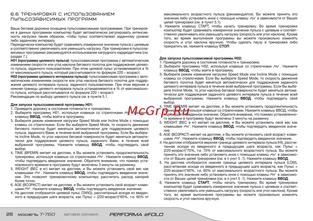 6 6 ТРЕНИРОВКА С ИСПОПЬЗОВРНИЕМ ПУПЬСОЗАВИСИМЫХ ПРОГРАММ Ваша беговая дорожка оснащена пульсозависимыми программами При трениров ке в данных программах компьютер будет автоматически регулировать интенсив ность нагрузки таким образом чтобы пульс соответствовал заданному уровню либо заданному интервалу Периодически компьютер будет сравнивать измеренное значение пульса с целевым и соответственно увеличивать или уменьшать нагрузку При тренировке в пульсоза висимых программах рекомендуется использование нагрудного кардиодатчика см раздел 7 Н01 программа целевого пульса пульсозависимая программа с автоматическим изменением скорости или угла наклона бегового полотна для поддержания целево го пульса заданного пользователем При этом целевой пульс устанавливается в от максимального пульса который рассчитывается по формуле 220 возраст Н02 программа целевого интервала пульса пульсозависимая программа с авто матическим изменением скорости или угла наклона бегового полотна для поддер жания целевого интервала пульса заданного пользователем При этом верхняя и нижняя границы целевого интервала пульса устанавливаются в от максимально го пульса который рассчитывается по формуле 220 возраст Рекомендации по выбору целевого пульса см в пункте 5 1 Для запуска пульсозависимой программы Н01 1 Приведите дорожку в состояние готовности к тренировке 2 Выберите программу Н01 используя клавиши со стрелочками AV Нажмите клавишу ввод чтобы войти в программу 3 Выберите режим изменения нагрузки Speed Mode или Incline Mode с помощью клавиш со стрелочками Если Вы выберете Speed Mode то скорость движения бегового полотна будет меняться автоматически для поддержания целевого пульса заданного Вами в течение всей выбранной программы Если Вы выбере те Incline Mode то угол наклона беговой поверхности будет меняться автомати чески для поддержания целевого пульса заданного Вами в течение всей выбранной программы Нажмите клавишу ВВОД чтобы подтвердить свой выбор 4 TIME ВРЕМЯ мигает на дисплее и Вы можете установить продолжительность тренировки используя клавиши со стрелочками AV Нажмите клавишу ВВОД чтобы подтвердить введенное значение Обратите внимание что помимо уста новленного времени в программу будут включены 3 минуты на разминку 5 WEIGHT ВЕС в кг мигает на дисплее и Вы можете установить свой вес как клавишами AV Нажмите клавишу ВВОД чтобы подтвердить введенное значе ние Это позволит тренировочному компьютеру рассчитать расход калорий более точно 6 AGE ВОЗРАСТ мигает на дисплее и Вы можете установить свой возраст клави шами AV Нажмите клавишу ВВОД чтобы подтвердить введенное значение 4 На дисплее отобразится целевой пульс TARG рассчитанный исходя из введен ного в предыдущем шаге возраста как Пульс 220 возраст 60 т е 60 от 26 МООЕПЬ T V5O БЕГОВРЯ ПОРОЖКИ PERFCJRMA EFOLD максимального возрастного пульса рекомендуется Вы можете принять это значение либо установить иное с помощью клавиш AV в зависимости от Ваших целей тренировки см в пункт 5 1 5 Нажмите клавишу СТАРТ чтобы начать тренировку Во время тренировки компьютер будет сравнивать измеренное значение пульса с целевым и соответ ственно увеличивать или уменьшать нагрузку скорость или угол наклона Кроме того во время выполнения программы вы можете произвольно изменять скорость и угол наклона вручную Чтобы сделать паузу в тр