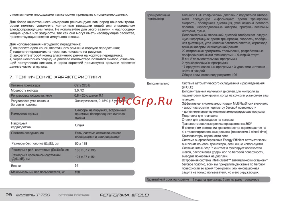 с контактными площадками также может приводить к искажению данных Тренировочный компьютер Большой LCD графический дисплей с подсветкой отобра жает следующую информацию время тренировки скорость пройденная дистанция угол наклона бегового полотна израсходованные калории профиль величины нагрузки пульс Дополнительный маленький дисплей отображает следую щую информацию время тренировки скорость пройден ная дистанция угол наклона бегового полотна израсходо ванные калории сканирующий режим 22 встроенные программы тренировки разработанные профессиональными физиологами быстрый старт В т ч 2 пользовательских программы 2 пульсозависимых программы 17 предустановленных программ с 3 уровнями интенсив ности в каждой Общее количество подпрограмм 106 Дополнительно Система автоматического складывания и раскладывания eFOLD Дополнительный маленький дисплей для контроля за параметрами тренировки когда на консоли установлен ваш планшет Эффективная система амортизации MultiFlexShock включает амортизаторы по периметру беговой поверхности дополнительные удлиненные амортизирующие подушки Подставка для планшета Отсеки для аксессуаров на консоли Транспортировочные ролики вращаются на 360 В сложенном состоянии тренажер легко перемещается на 4 х транспортировочных роликах технология 4 wheel drive Компенсаторы неровности пола Система энергосбережения Energy Efficient автоматически выключит консоль тренажера если он не используется Система Intelli Step считает и фиксирует количество шагов распознавая удары ног по беговой поверхности выводит показания на дисплей Встроенная система Intelli Guard автоматически остановит беговое полотно если вы прекратите движение по беговой поверхности во время тренировки это инновационная защита не только пользователя но и его окружающих Для более качественного измерения рекомендуем вам перед началом трени ровки немного увлажнить контактные площадки водой или специальным электропроводящим гелем Не используйте для этого вазелин и маслосодер жащие крема или жидкости так как они могут иметь изолирующие свойства препятствующие снятию импульсов с кожи Для использования нагрудного передатчика 1 закрепите один конец эластичного ремня на корпусе передатчика 2 наденьте передатчик на торс как показано на рисунке 3 закрепите второй конец эластичного ремня на корпусе передатчика 4 через несколько секунд на дисплее компьютера появится символ означаю щий поступление сигнала и через короткий промежуток времени появятся данные частоты пульса 7 ТЕХНИЧЕСКИЕ ХОРОКТЕРИСТИКИ Питание тренажера Сеть 220 В Мощность мотора 3 0 ЛС Регулировка скорости км ч 0 8 20 с шагом 0 1 Регулировка угла наклона бегового полотна Электрическая 0 15 15 уровней Измерение пульса Сенсоры на поручнях встроенный приемник беспроводного сигнала пульса Нагрудный кардиодатчик Опция Система складывания Есть система автоматического складывания и раскладывания Размеры бег полотна ДхШ см 50 х 138 Размеры в раб состоянии ДхШхВ см 185 х 87 х 135 Размеры в сложенном состоянии ДхШхВ см 121 х 87x151 Вес кг 94 Максимальный вес пользователя кг 130 В в Гарантийный срок на изделие 2 года на тренажер 5 лет на раму тренажера 28 МООЕПЬ T V5O БЕГОВЯЯ ПОРОЖКИ PERFCJRMA EFOLD