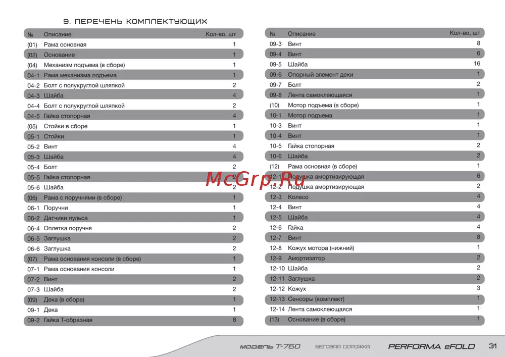 9 ПЕРЕЧЕНЬ КОМППЕКТУОЩИХ Кол во шт Описание 1 09 3 Винт 8 Основание 1 09 4 Винт 6 04 Механизм подъема в сборе 1 09 5 Шайба 04 1 Рама механизма подъема 09 6 Опорный элемент деки 04 2 Болт с полукруглой шляпкой 1 2 09 7 Болт 04 3 Шайба 4 09 8 Лента самоклеющаяся 04 4 Болт с полукруглой шляпкой 2 Ю Мотор подъема в сборе 04 5 Гайка стопорная 4 10 1 Мотор подъема 05 Стойки в сборе 1 10 3 Винт 05 1 Стойки 1 10 4 Винт 05 2 Винт 4 10 5 Гайка стопорная 2 05 3 Шайба 4 10 6 Шайба 2 05 4 Болт 2 12 Рама основная в сборе 1 05 5 Гайка стопорная 2 12 1 Подушка амортизирующая 6 05 6 Шайба 2 12 2 Подушка амортизирующая 2 06 Рама с поручнями в сборе 12 3 Колесо 4 06 1 Поручни 1 1 12 4 Винт 4 06 2 Датчики пульса 1 12 5 Шайба 4 06 4 Оплетка поручня 2 12 6 Гайка 4 06 5 Заглушка 2 12 7 Винт 8 06 6 Заглушка 2 12 8 Кожух мотора нижний 1 07 Рама основания консоли в сборе 12 9 Амортизатор 2 07 1 Рама основания консоли 1 1 07 2 Винт 07 3 Шайба 09 Дека в сборе 09 1 Дека 09 2 Гайка Т образная Описание 01 Рама основная 02 Кол во шт 16 2 1 1 12 10 Шайба 2 2 12 11 Заглушка 2 2 12 12 Кожух 3 12 13 Сенсоры комплект 1 12 14 Лента самоклеющаяся 1 1 8 13 мааепь Т УБО 1 Основание в сборе БЕГОВАЯ ПОРОЖКА PERFORMA eFOLD 31