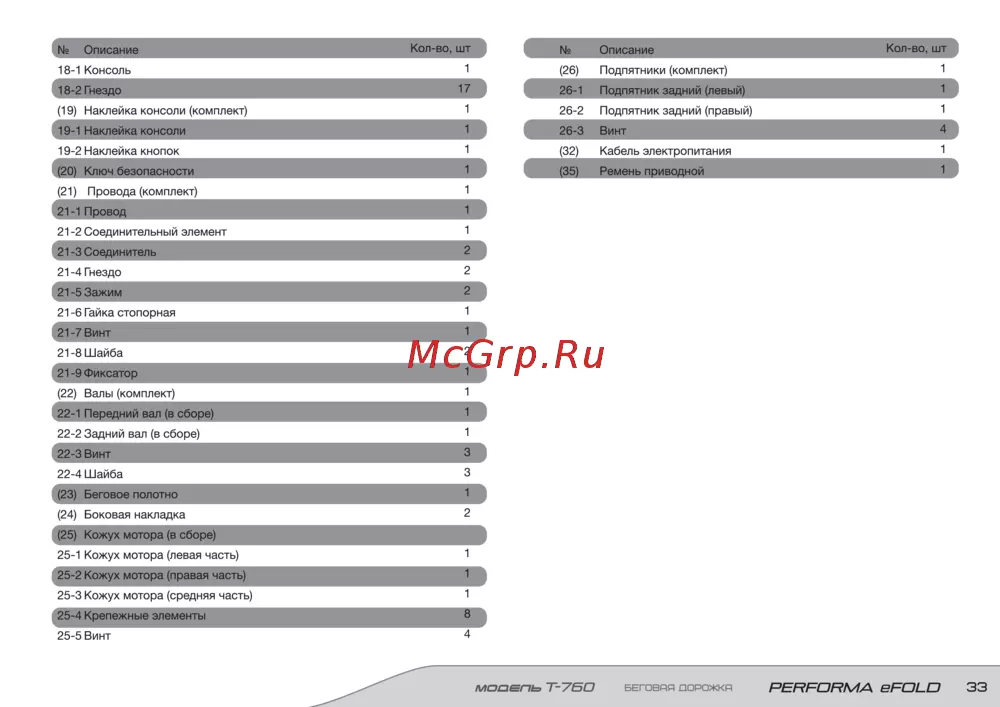 Описание Кол во шт 18 1 Консоль 18 2 Гнездо 19 Наклейка консоли комплект Описание 1 26 Подпятники комплект 17 26 1 Подпятник задний левый 1 26 2 Подпятник задний правый 1 26 3 Винт 4 32 Кабель электропитания 1 35 Ремень приводной 19 1 Наклейка консоли 19 2 Наклейка кнопок 1 20 Ключ безопасности 21 Провода комплект Кол во шт 1 1 21 1 Провод 21 2 Соединительный элемент 1 21 3 Соединитель 2 21 4 Гнездо 2 21 5 Зажим 2 21 6 Гайка стопорная 1 21 7 Винт 21 8 Шайба 2 21 9 Фиксатор 22 Валы комплект 1 22 1 Передний вал в сборе 22 2 Задний вал в сборе 1 22 3 Винт 3 22 4 Шайба 3 23 Беговое полотно 24 Боковая накладка 2 25 Кожух мотора в сборе 25 1 Кожух мотора левая часть 1 25 2 Кожух мотора правая часть 1 25 3 Кожух мотора средняя часть 1 25 4 Крепежные элементы 8 25 5 Винт 4 МОДЕПЬ Т ТБО БЕГОВАЯ ПОРОЖКА РЕР РОРМА еРОЕЮ 33