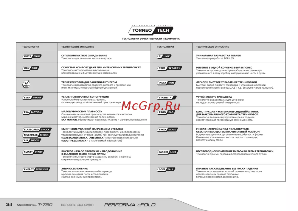 ТЕХНОЛОГИИ TORNEO TORNEO k TECH ТЕХНОЛОГИИ ЭФФЕКТИВНОСТИ И КОМФОРТА ТЕХНОЛОГИЯ INSTA Г FOLC DRY J CRIP J ТЕХНИЧЕСКОЕ ОПИСАНИЕ ТЕХНОЛОГИЯ ТЕХНИЧЕСКОЕ ОПИСАНИЕ СУПЕРКОМПАКТНОЕ СКЛАДЫВАНИЕ b i УНИКАЛЬНАЯ РАЗРАБОТКА TORNEO Технология для экономии места в квартире СУХОСТЬ И КОМФОРТ ДАЖЕ ПРИ ИНТЕНСИВНЫХ ТРЕНИРОВКАХ TAKE j Технология использования впитывающих влагоотводящих и быстросохнущих материалов ТРЕНАЖЕР ГОТОВ ДЛЯ ЗАНЯТИЙ ФИТНЕСОМ UNIC INSTAj Технология производства продукта готового к применению или с минимально простой сборкой установкой УСИЛЕННАЯ ПРОЧНАЯ КОНСТРУКЦИЯ EVER f PROOF EXAJ MOTION Износостойкие усиленные материалы гарантирующие долгий жизненный срок тренажера ELASBOARDj SHOCK MULTIFLEXJ SHOCK AI R J SHOCK SM ART i START МАЛОШУМНОСТЬ И ПЛАВНОСТЬ Специальная технология производства маховиков и моторов Маховик и мотор выполненные по технологии ЕХА MOTION обеспечивают надежное плавное и малошумное вращение СМЯГЧЕНИЕ УДАРНОЙ НАГРУЗКИ НА СУСТАВЫ Технологии амортизации беговой поверхности и виброразвязки ударной нагрузки от пола шума при эксплуатации пользователем ELASBOARD SHOCK AIR SHOCK с постоянной жесткостью MULTIPLEX SHOCK с изменяемой жесткостью БЫСТРОЕ НАЧАЛО ПРОБЕЖКИ И ПРОДОЛЖЕНИЕ В ЗАДАННОМ ТЕМПЕ ПОСЛЕ ПАУЗЫ Уникальная разработка TORNEO N CARRY RUN ЛЕГКОЕ И БЫСТРОЕ УПРАВЛЕНИЕ ТРЕНИРОВКОЙ Быстрый выбор скорости тренажера и угла наклона беговой поверхности кнопки выбора 2 4 6 и т д бесступенчатые ползунки УСТОЙЧИВОСТЬ ТРЕНАЖЕРА STABILITA ERGOj РЕШЕНИЕ В ОДНОЙ КОРОБКЕ ВЗЯЛ И ПОНЕС Технология производства крупногабаритного тренажера упакованного в одну коробку которую можно нести в руках Технология выравнивания для установки на недостаточно ровной поверхности PAD КОНСТРУКЦИЯ И МАТЕРИАЛЫ СИДЕНИЙ СПИНОК ДЛЯ МАКСИМАЛЬНОГО КОМФОРТА ТРЕНИРОВОК Технология толщины и упругости седел и подушек обеспечивающая превосходную эргономичность ERGOj MOVE ГИБКАЯ НАСТРОЙКА ПОД ПОЛЬЗОВАТЕЛЯ ОБЕСПЕЧИВАЮЩАЯ ИСКЛЮЧИТЕЛЬНЫЙ КОМФОРТ Встроенные рукоятки эргономичные особенности формы Изменение угла наклона высоты под рост длину рук полноту и длину стопы CARDIO J LINK БЕСПРОВОДНОЕ ИЗМЕРЕНИЕ ПУЛЬСА ВО ВРЕМЯ ТРЕНИРОВКИ Технология приема передачи беспроводного сигнала пульса Технология быстрого старта с заданием скорости и наклона сохранение параметров при паузе ENERGY EFFICIENT j 34 мааЕПЬ Т 7БО ЭНЕРГОСБЕРЕЖЕНИЕ Технология автовыключения либо перехода в режим ожидания после использования с целью экономии электроэнергии БЕГОВЯЯ ПОРОЖКИ PERFORMA EFOLD SOFT J FALL ПЛАВНОЕ РАСКЛАДЫВАНИЕ БЕЗ РИСКА ПАДЕНИЯ Технология оснащения системой газовых амортизаторов обеспечивающих плавное опускание беговых поверхностей дорожек и т д