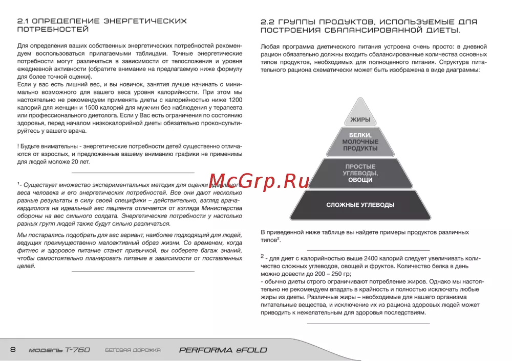 2 1 ОПРЕПЕПЕНИЕ ПОТРЕБНОСТЕЙ ЭНЕРГЕТИЧЕСКИХ Для определения ваших собственных энергетических потребностей рекомен дуем воспользоваться прилагаемыми таблицами Точные энергетические потребности могут различаться в зависимости от телосложения и уровня ежедневной активности обратите внимание на предлагаемую ниже формулу для более точной оценки Если у вас есть лишний вес и вы новичок занятия лучше начинать с мини мально возможного для вашего веса уровня калорийности При этом мы настоятельно не рекомендуем применять диеты с калорийностью ниже 1200 калорий для женщин и 1500 калорий для мужчин без наблюдения у терапевта или профессионального диетолога Если у Вас есть ограничения по состоянию здоровья перед началом низкокалорийной диеты обязательно проконсульти руйтесь у вашего врача 2 2 ГРУППЫ ПРОДУКТОВ ИСПОПЬЗУЕМЫЕ ДПР ПОСТРОЕНИЯ СБРПРНСИРОВРННОЙ ДИЕТЫ Любая программа диетического питания устроена очень просто в дневной рацион обязательно должны входить сбалансированные количества основных типов продуктов необходимых для полноценного питания Структура пита тельного рациона схематически может быть изображена в виде диаграммы Будьте внимательны энергетические потребности детей существенно отлича ются от взрослых и предложенные вашему вниманию графики не применимы для людей моложе 20 лет 1 Существует множество экспериментальных методик для оценки идеального веса человека и его энергетических потребностей Все они дают несколько разные результаты в силу своей специфики действительно взгляд врачакардиолога на идеальный вес пациента отличается от взгляда Министерства обороны на вес сильного солдата Энергетические потребности у настолько разных групп людей также будут сильно различаться Мы постарались подобрать для вас вариант наиболее подходящий для людей ведущих преимущественно малоактивный образ жизни Со временем когда фитнес и здоровое питание станет привычкой вы соберете багаж знаний чтобы самостоятельно планировать питание в зависимости от поставленных целей 8 МОПЕПЬ Т 7БО БЕГОВРЯ ПОРОЖКИ PERFCJRMA EFOLD СЛОЖНЫЕ УГЛЕВОДЫ В приведенной ниже таблице вы найдете примеры продуктов различных типов2 для диет с калорийностью выше 2400 калории следует увеличивать коли чество сложных углеводов овощей и фруктов Количество белка в день можно довести до 200 250 гр обычно диеты строго ограничивают потребление жиров Однако мы настоя тельно не рекомендуем впадать в крайность и полностью исключать любые жиры из диеты Различные жиры необходимые для нашего организма питательные вещества и исключение их из рациона здоровых людей может приводить к нежелательным для здоровья последствиям