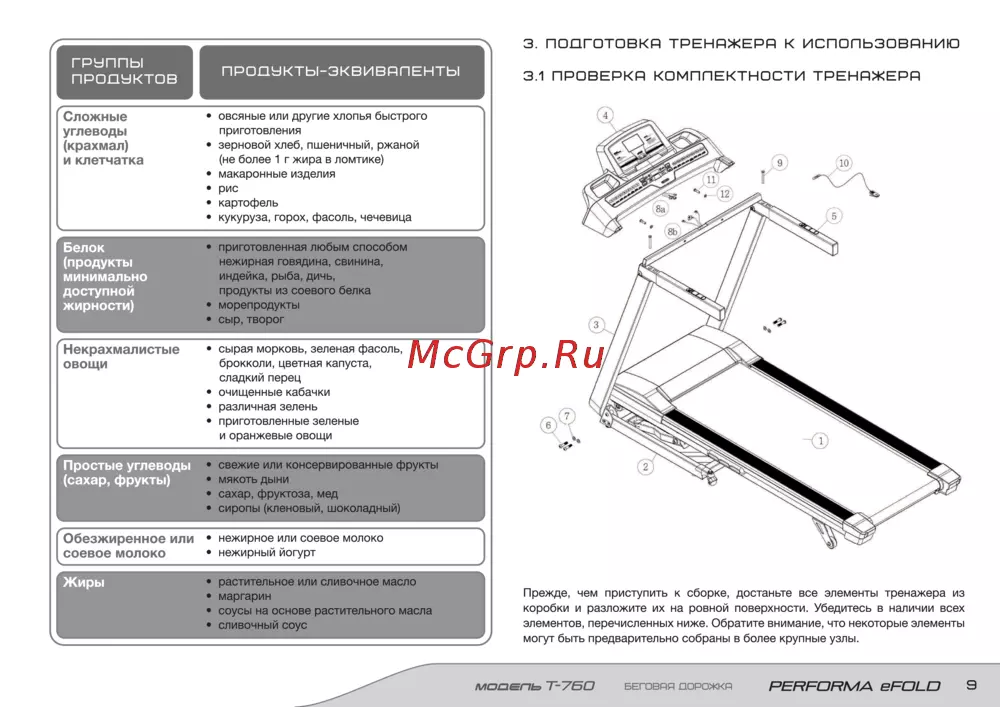 3 ПОПГОТОВКЯ ТРЕНЯЖЕРЯ к испопьзовянию ГРУППЫ ПРОПУКТОВ углеводы крахмал и клетчатка Белок продукты минимально доступной жирности г приготовленная любым способом нежирная говядина свинина индейка рыба дичь продукты из соевого белка морепродукты сыр творог сырая морковь зеленая фасоль брокколи цветная капуста сладкий перец очищенные кабачки различная зелень приготовленные зеленые и оранжевые овощи Простые у гл 1еводы сахар фру пы свежие или консервированные фрукты мякоть дыни сахар фруктоза мед сиропы кленовый шоколадный г Жиры 3 1 ПРОВЕРКА КОМППЕКТНОСТИ ТРЕНАЖЕРА овсяные или другие хлопья быстрог приготовления зерновой хлеб пшеничный ржаной не более 1 г жира в ломтике макаронные изделия рис картофель кукуруза горох фасоль чечевица Некрахмалистые овощи Обезжиренное или соевое молоко к ПРОПУКТЫ ЗКВИВЯПЕНТЫ нежирное или соевое молоко нежирный йогурт растительное или сливочное масло маргарин соусы на основе растительного масла сливочный соус Прежде чем приступить к сборке достаньте все элементы тренажера из коробки и разложите их на ровной поверхности Убедитесь в наличии всех элементов перечисленных ниже Обратите внимание что некоторые элементы могут быть предварительно собраны в более крупные узлы МОДЕПЬ Т ТБО БЕГОВЯЯ ДОРОЖКА РЕНРОНМА еРОЬО 9
