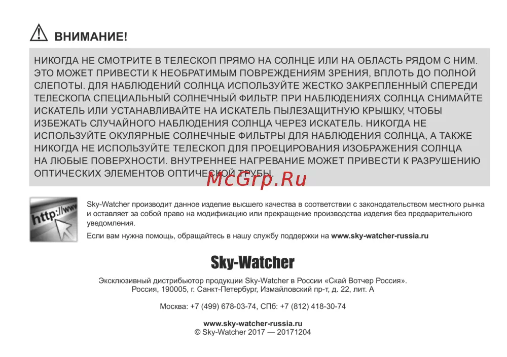 Sky-Watcher производит данное изделие высшего качества в соответствии с законодательством местного рынка