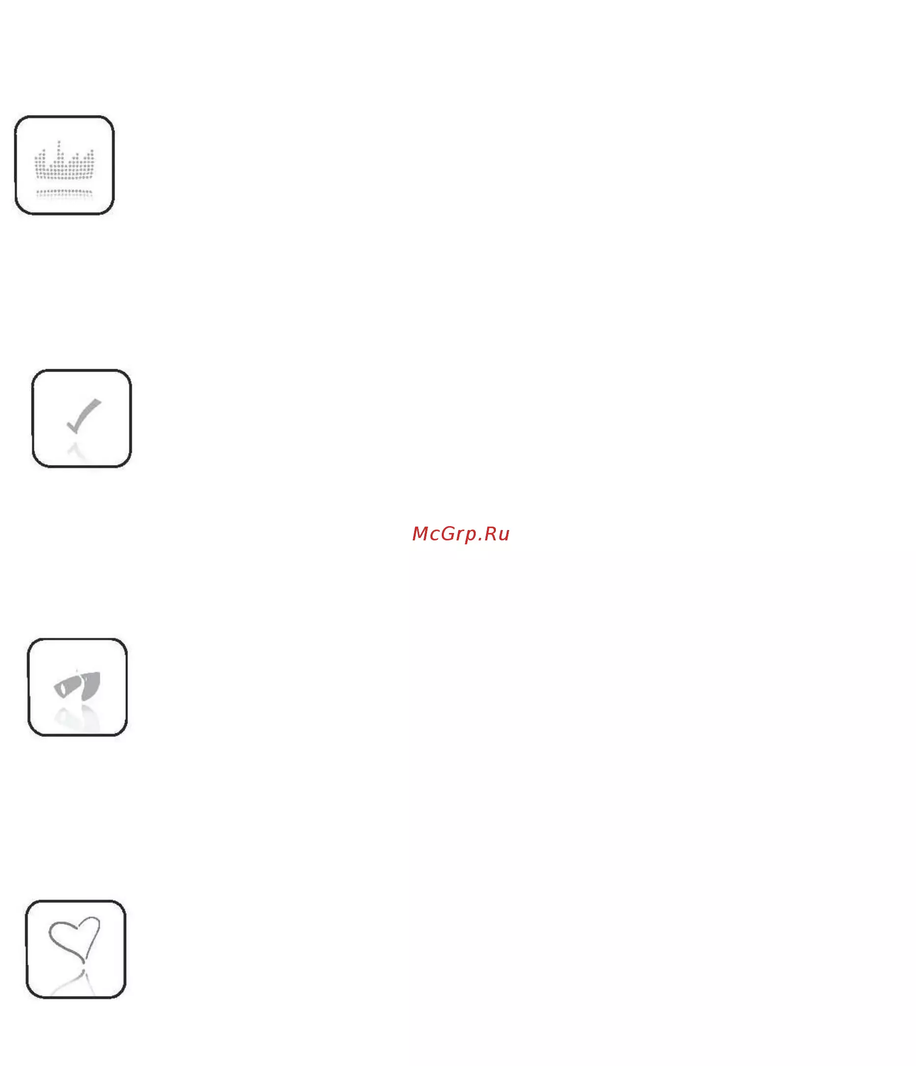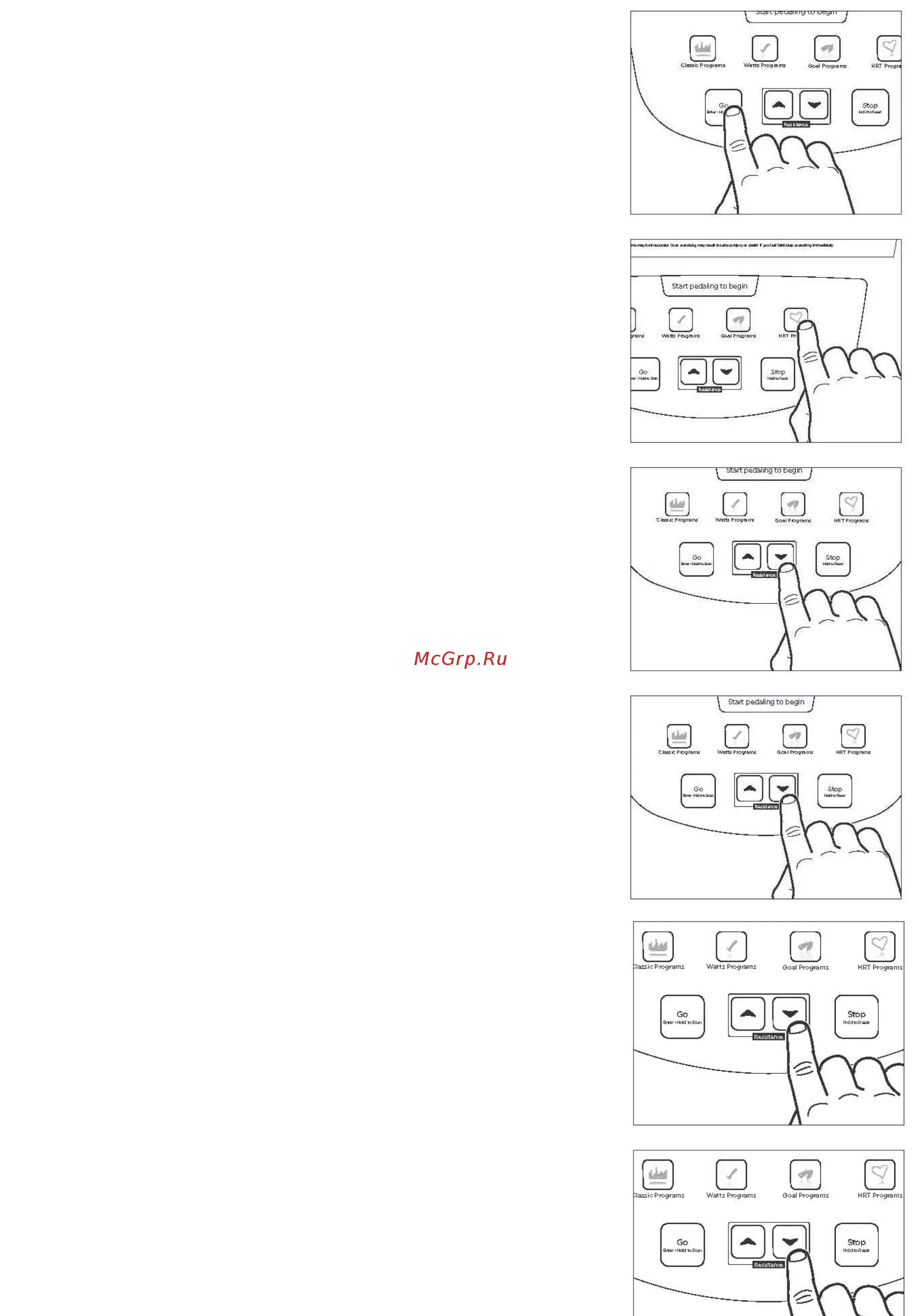 ОПИСАНИЕ ПРОГРАММ CLASSICS КЛАССИЧЕСКИЕ ПРОГРАММЫ MANUAL РУЧНОЕ пользователем УПРАВЛЕНИЕ программа в которой уровень сопротивления меняется INTERVAL ИНТЕРВАЛ эффективный вид тренировки способствующий укреплению сердечно сосудистой системы путем чередования периодов нагрузки и расслабления Постарайтесь чтобы нагрузка была достаточно интенсивной FAT BURN СЖИГАНИЕ ЖИРА программа направленная направленная на сжигание запасов жира Тренировка проходит с меньшим уровнем сопротивления но в течение более длительного времени RANDOM СЛУЧАЙНАЯ ПОСЛЕДОВАТЕЛЬНОСТЬ программа для тех кто предпочитает разнообразие в тренировках Уровень сопротивления меняется в случайном порядке ВАТТ ЗАВИСИМЫЕ ПРОГРАММЫ CONSTANT расход WATTS энергии ПОСТОЯННАЯ НАГРУЗКА Поддержание целевого позволяет уровня задать расхода целевую энергии величину ватт обеспечивается автоматическим изменением уровня сопротивления INTERVAL WATTS ВАТТ ЗАВИСИМАЯ ТРЕНИРОВКА С ЧЕРЕДУЮЩЕЙСЯ НАГРУЗКОЙ позволяет задать два значения ватт высокое и низкое на чередовании которых будет построена программа Это обеспечивает высокую интенсивность и эффективность тренировки HILL WATTS ВАТТ ЗАВИСИМАЯ ТРЕНИРОВКА ХОЛМЫ позволяет задать 4 значения ватт Каждое из них поддерживается в течение минуты цикл повторяется до окончания программы Идеальная сточки зрения нагрузки тренировка ЦЕЛЕВЫЕ ПРОГРАММЫ TIME GOAL ЦЕЛЕВОЕ ВРЕМЯ с помощью заданного целевого времени вы можете контролировать продолжительность тренировки DISTANCE GOAL ЦЕЛЕВОЕ РАССТОЯНИЕ с помощью заданного целевого расстояния вы можете контролировать протяженность тренировки CALORIES GOAL ЦЕЛЕВЫЕ КАЛОРИИ с помощью заданного целевого количества калорий вы можете контролировать интенсивность вашей тренировки ПРОГРАММЫ С УЧЕТОМ ЧАСТОТЫ ПУЛЬСА HRT8 ч HRT INTERVAL ТРЕНИРОВКА С УЧЕТОМ ЧАСТОТЫ ПУЛЬСА ИНТЕРВАЛ нагрузка варьируется в диапазоне 8070 от предполагаемой максимальной частоты пульса Цель данной программы укрепление сердечно сосудистой системы Пользователь должен удерживать ладони на контактных датчиках пульса или надеть телеметрический ремень датчик HRT WEIGHT LOSS СБРОС ВЕСА С КОНТРОЛЕМ ПУЛЬСА тренировка с меньшей нагрузкой позволяющая израсходовать больше калорий Пользователь должен удерживать ладони на контактных датчиках пульса или надеть телеметрический ремень датчик Уровень сопротивления автоматически корректируется для поддержания 65 от максимальной частоты пульса 9