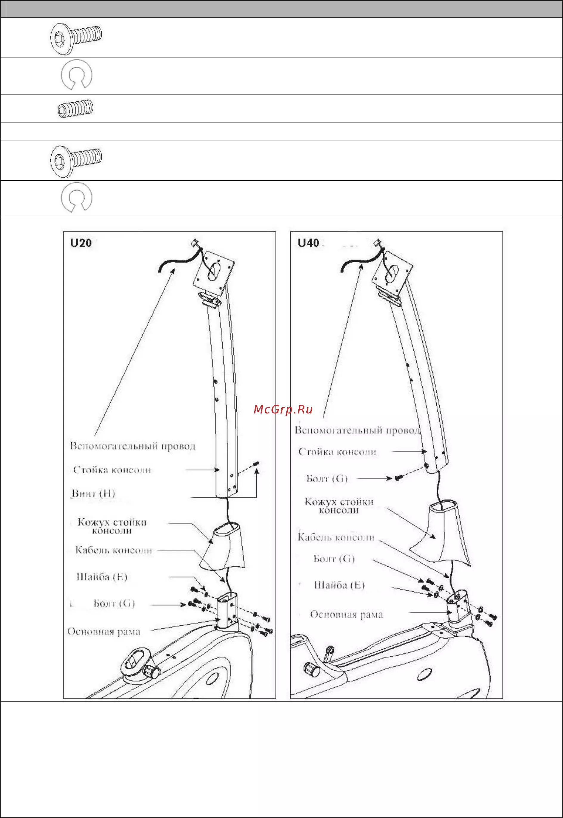ШАГ 2 В Сборочный комплект о О 1 Болт О 15 мм Кол во 6 шт Пружинная шайба Е 13 5 мм Кол во 6 шт Винт Н 10 мм Кол во 1 шт Болт О 15 мм Кол во 5 шт Пружинная шайба Е 13 5 мм Кол во 4 шт Только для 1140 о 1 Откройте сборочный комплект 2 2 Закрепите крышку стойки консоли на стойке 3 С помощью вспомогательного провода протяните кабель консоли через стойку Закрепите стойку на основной раме 4 Для Т_Г20 Зафиксируйте стойку консоли на основной раме используя 5 болтов О и 4 пружинные шайбы Е 5 Закрепите крышку стойки на основной раме 12