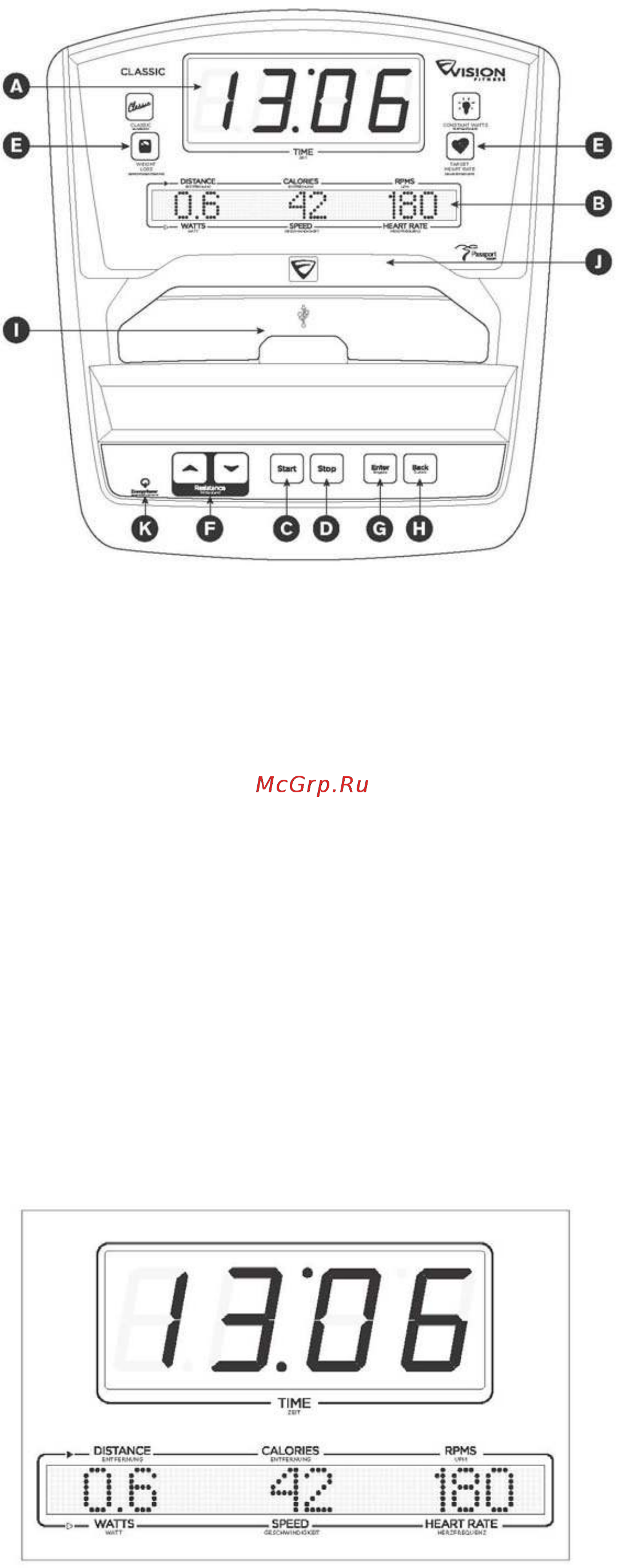 Модель консоли Classic Примечание Удалите защитную пленку перед началом работы с консолью А СВЕТОДИОДНЫЙ ДИСПЛЕЙ отображается информация о тренировке В БУКВЕННО ЦИФРОВОЙ ДИСПЛЕЙ на дисплее отображаются угол наклона расстояние скорость калории темп профиль тренировки и уровень пульса С СТАРТ START включение начало определенной тренировки возобновление тренировки после паузы D СТОП STOP выключение пауза Удержание кнопки в течение 3 секунд возврат в исходное положение Е КНОПОКИ ПРОГРАММ выбор программы уровня и времени а также другие опции F КНОПКИ РЕГУЛИРОВАНИЯ УРОВНЯ СОПРОТИВЛЕНИЯ G ВВОД ENTER подтверждение выбора программы во время тренировки изменение дисплея обратной связи Н КНОПКА BACK возврат к предыдущему шагу во время настройки I USB Порт используется для обновления програмного обеспечения J ПОДСТАВКА ДЛЯ КНИГИ К Индикатор сохранения энергии индикатор загорается при режиме сохранения энергии Нажмите любую кнопку для выхода из данного режима ОКНА ДИСПЛЕЯ НА КОНСОЛИ CLASSIC 13 0Б TIME ПРОФИЛЬ ТРЕНИРОВКИ Показывает уровень угла наклона или выбранную тренировку 23