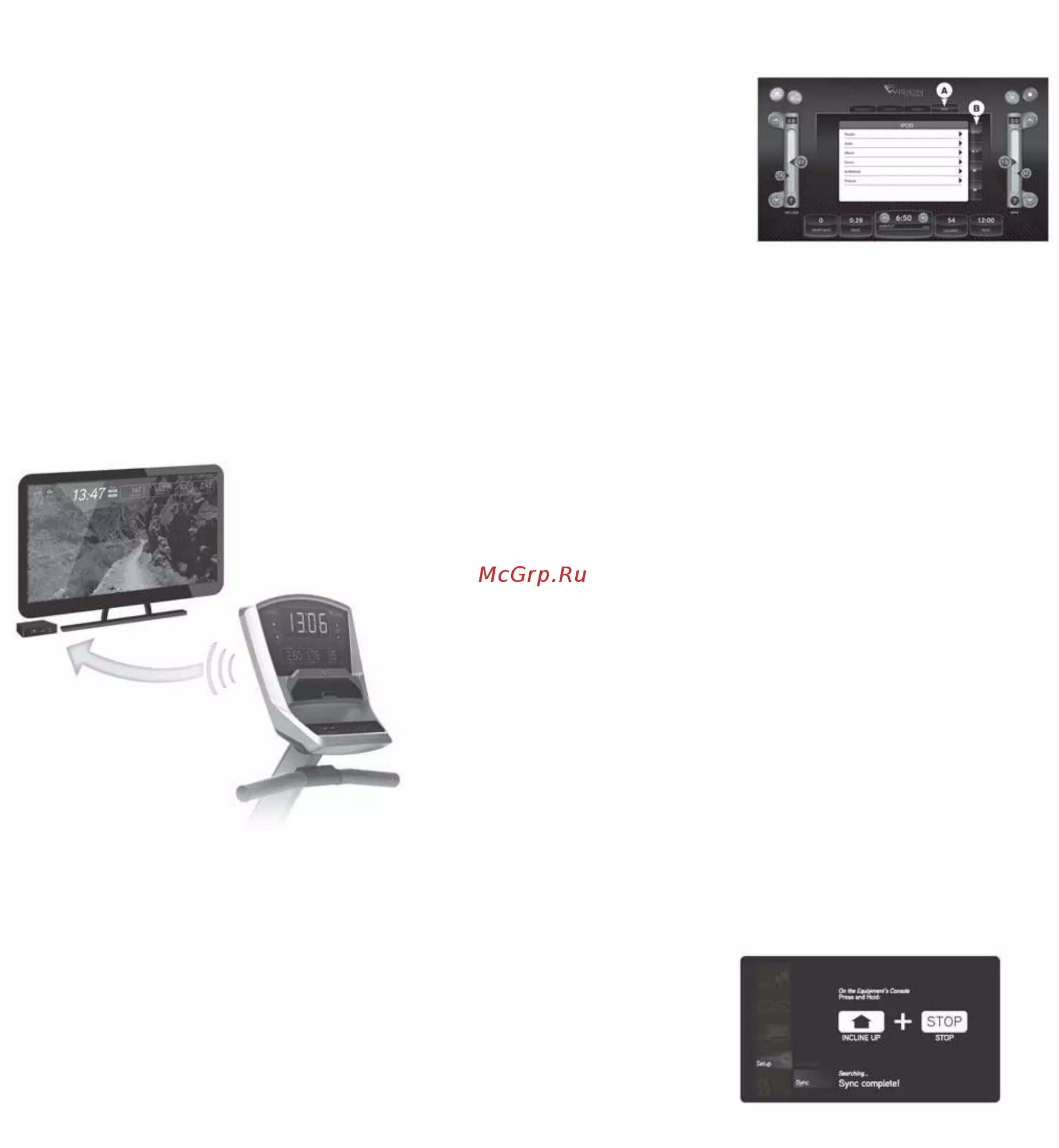 6 Отключите устройство Nike Plus и синхронизируйте его с iTunes 7 Войдите в ваш персональный счет и просмотрите информацию ПОДКЛЮЧЕНИЕ iPod ИЛИ iPhone На консоли встроен разъем для подключения iPod кабеля Для того чтобы подключить iPod или iPhone необходимо 1 Подключите один конец кабеля у консоли а второй к устройству В теение первых 10 секунд консоль будет проверять подлинность устройства 2 Во время тренировки нажмите вкладку iPod А Выберете аудио или видео далее следуйте указанием на дисплее Во время просмотра видео в полноэкранном формате нажмите в центр дисплея и наооброт В Медиа Примечание Если вам не нужны динамики вы можете подключить наушники предназначенный для них разъем в РОУТЕР PASSPORT ДЛЯ ВИРТУАЛЬНОГО ЛАНДШАФТА Виртуальный ландшафт Passport является сложным комплексом высокотехнологических решений с использованием самых последних достижений в электронике программном обеспечении и биомеханике В основе технологии лежит использование интерактивного видео полностью синхронизированного с движениями пользователя Свяжитесь с дилером или уполномоченным представителем в вашем городе чтобы купить роутер Более подробную информацию о роутете PASSPORT вы можете найти на сайтах world passportplayer com или www visionfitness com СИНХРОНИЗАЦИЯ КОНСОЛИ И РОУТЕРА 1 Используйте кнопки стрелки на роутере выберете иконку Setup Настройка затем нажмите Select Выбрать ЙС 2 Следуйте инструкциям на дисплее нажмите и удержите ЕЯ БЕЗ INCUKSIP STOP кнопки Incline up Наклон вверх и Stop Стоп на консоли 3 На экране появится сообщение об успешной неуспешной синхронизации Примечание Для более подробной информации вы можете ознакомиться с руководством пользователя роутера PASSPORT для виртуального ландшафта V Sync compWel 41