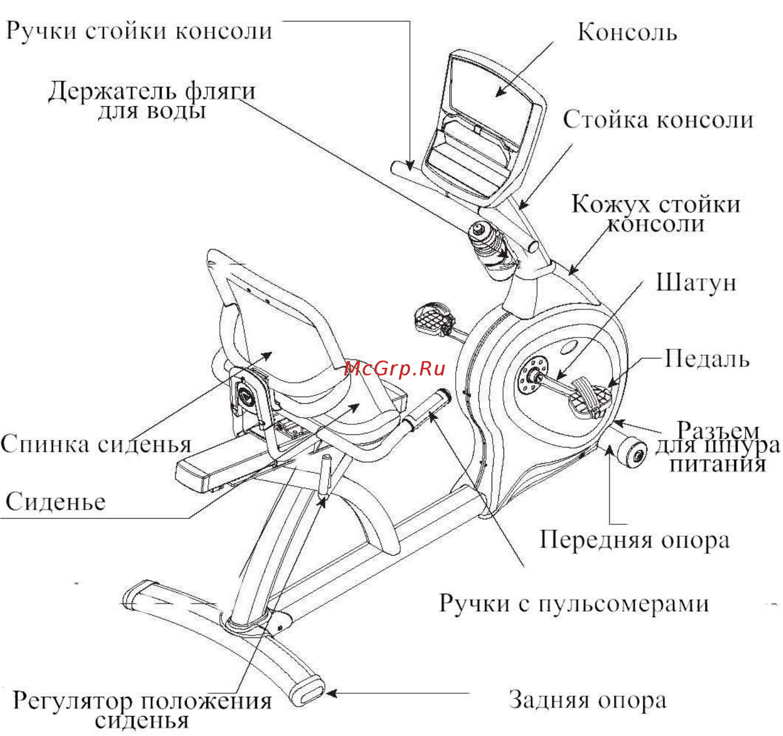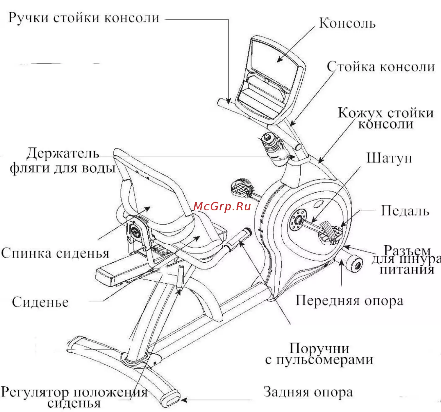 И40 РУЧКИ стоики консоли Держатель фляги для воды Консоль тонка консоли Кожух стойки жбпеоли Шатун П ед аль Спинка синенья л т т ра питания Сиденье I средняя опора ел Регулятор положения сиденья Ручки с пульсомсрами Задняя опора СОВЕТЫ ПЕРЕД НАЧАЛОМ СБОРКИ РАСПАКОВКА Начинайте распаковку тренажера в том месте где он будет установлен после сборки Поверхность пола должна быть ровной Рекомендуется использовать коврик под тренажер во избежание повреждения напольного покрытия ПРИМЕЧАНИЕ После сборки каждого шага убедитесь что все болты гайки тренажера на месте и плотно затянуты ПРИМЕЧАНИЕ Применение смазочных материалов например литиевой смазки может помочь вам при сборке 10