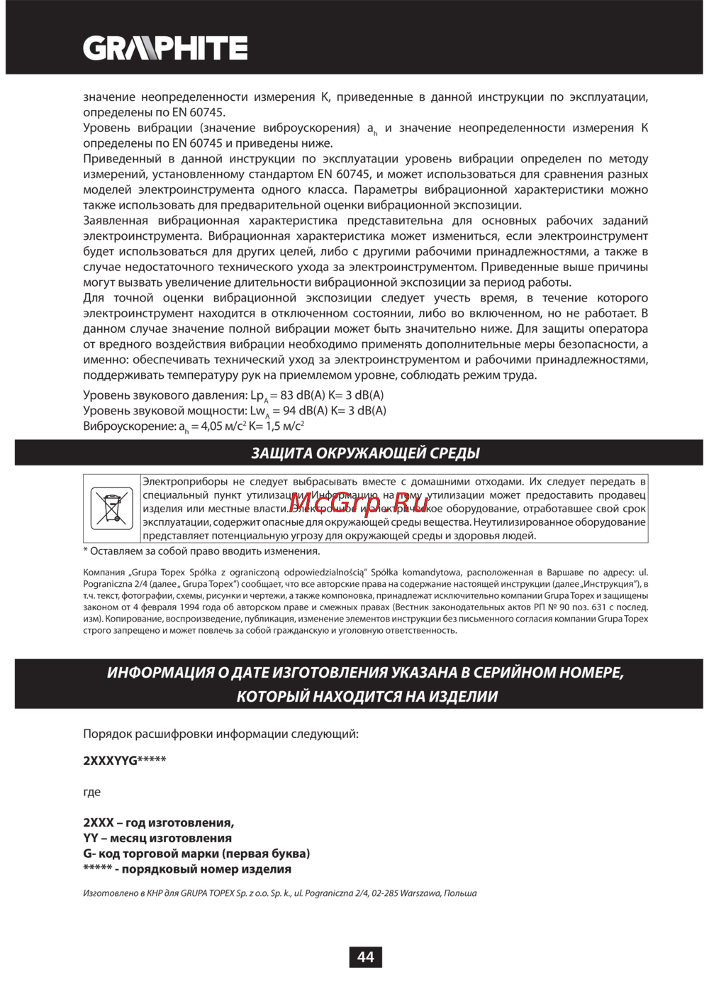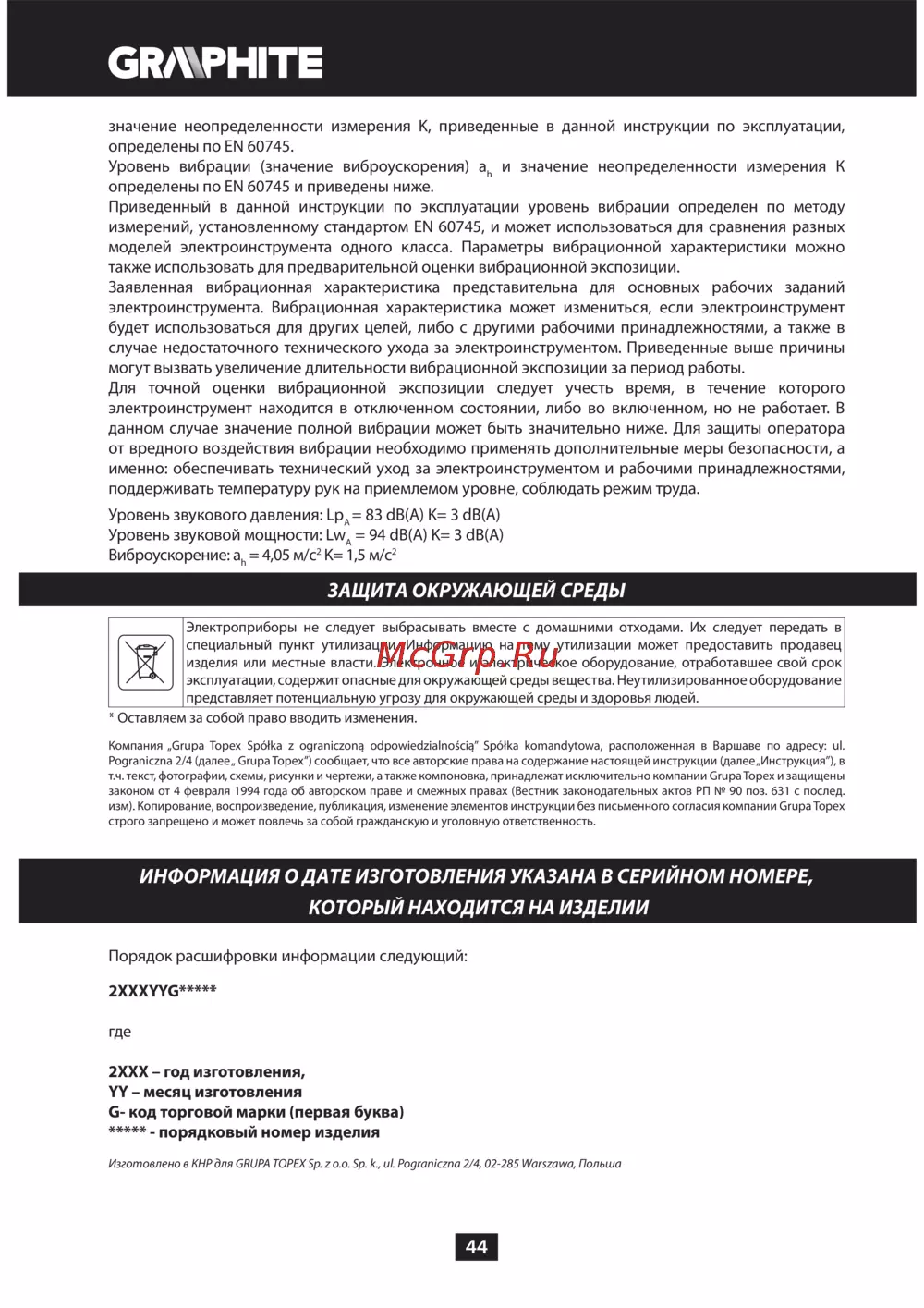 GRAPHITE 59G072 [44/188] Информация о дате изготовления указана в серийном номере который находится на изделии