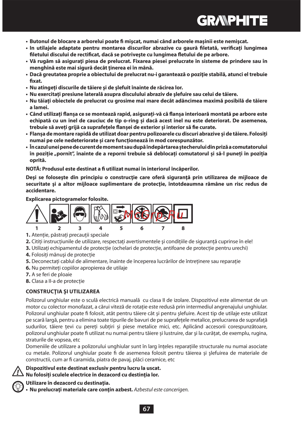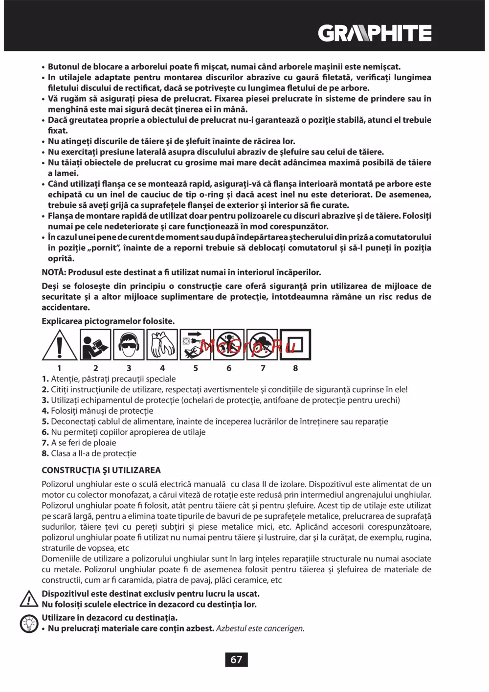 GRAPHITE 59G072 — ghid de utilizare și siguranță pentru polizoare unghiulare [67/188]