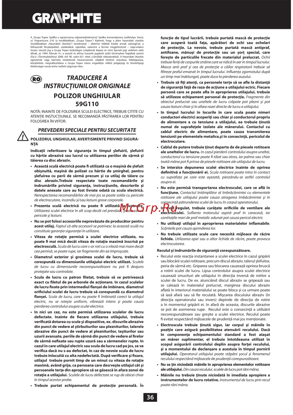 GRAPHITE 59G110 — instrucțiuni siguranță polizoare unghiulare - Grupa Topex [36/100]