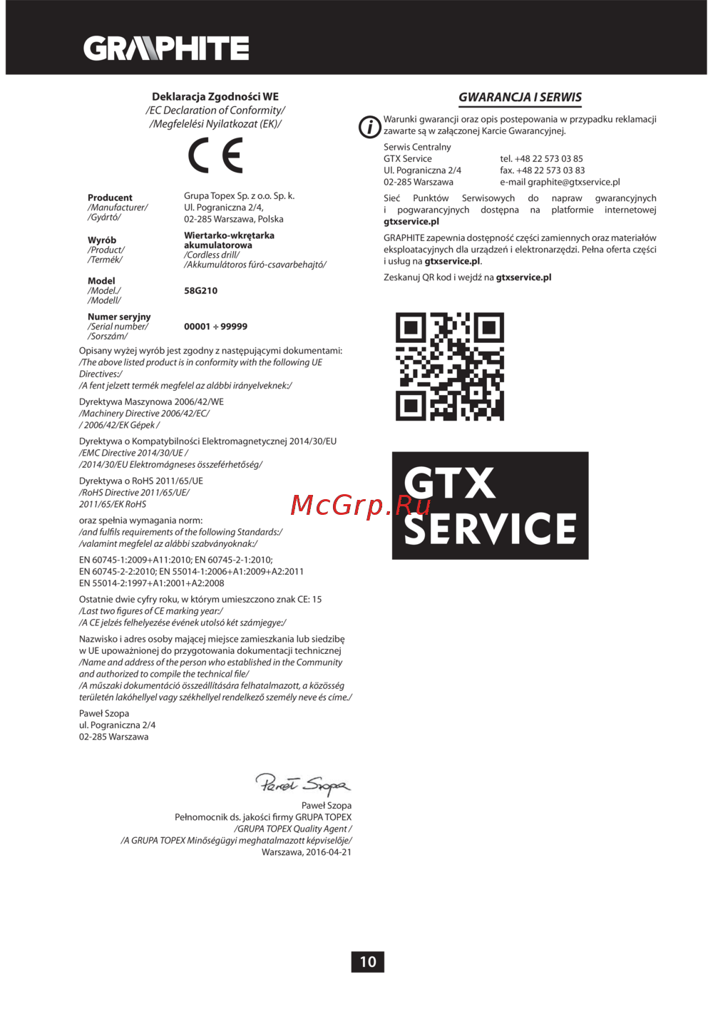 GRAPHITE 58G210 [10/80] Gwarancja i serwis