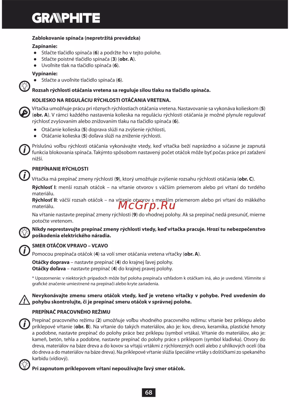 GRAPHITE 58G712 — nastavenie a ovládanie vŕtačky: Rýchlosť, smer a režimy [68/104]