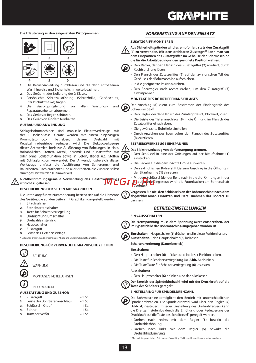 GRAPHITE 58G725 [13/64] Vorbereitung auf den einsatz